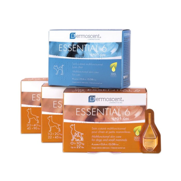 Dermoscent ESSENTIAL 6 é um spot-on de aplicação semanal, à base de ácidos gordos e óleos essenciais destinados à manutenção da barreira hidrolipídica da pele, indicado para situações de seborreia (seca ou oleosa), queda de pêlo, pele/pêlo seco, ictiose, dermatite atópica, adenite sebácea, mau odor ou outras disfunções da barreira da pele.